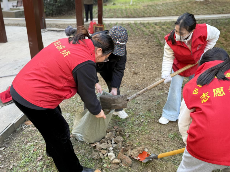 11月的最后一个周六,在荣城花园北苑的小广场上,志愿者徐睆睆跟同伴们正在清里绿化带里的碎石块。