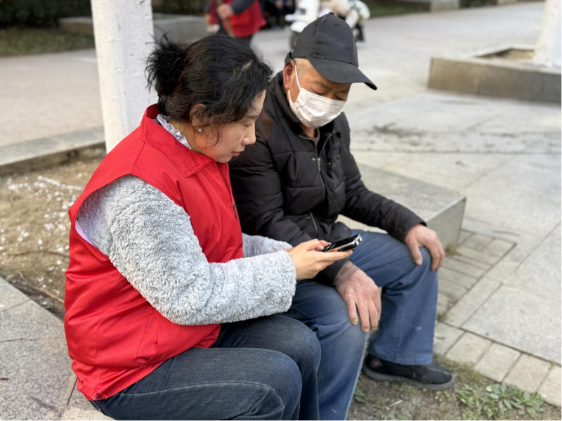 老人抬头看到身穿红马甲的志愿者,笑着说:“可不是嘛,我儿子刚发信息给我,也不知道是不是要回家吃午饭,可这手机字太小了,我看半天没能看全,实在是看不清楚。”