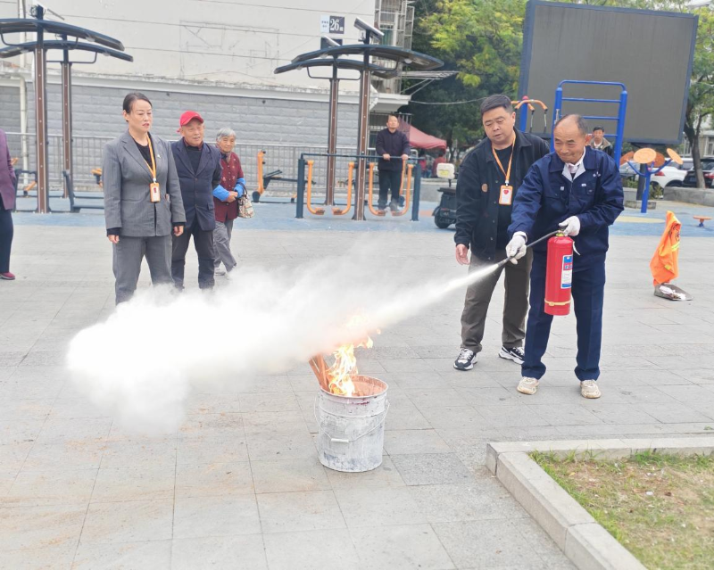 为将安全知识转化为防护技能,此次活动还设置了灭火器实操体验环节。物业安全专员搬来干粉灭火器,在空地上设置模拟火点,手把手教学:“一提手柄,二拔保险销,三握喷管对准火焰根部,四压压把,记住要站在上风向!”家住小区8栋的张叔叔第一个上前尝试,在专员指导下顺利“灭火”后,他笑称:“以前只听过‘提拔握压’,今天亲手操作才明白,关键要快、要准,火一着起来了一秒也不能耽搁!”不少居民纷纷排队体验,在安全距离内学习操作。